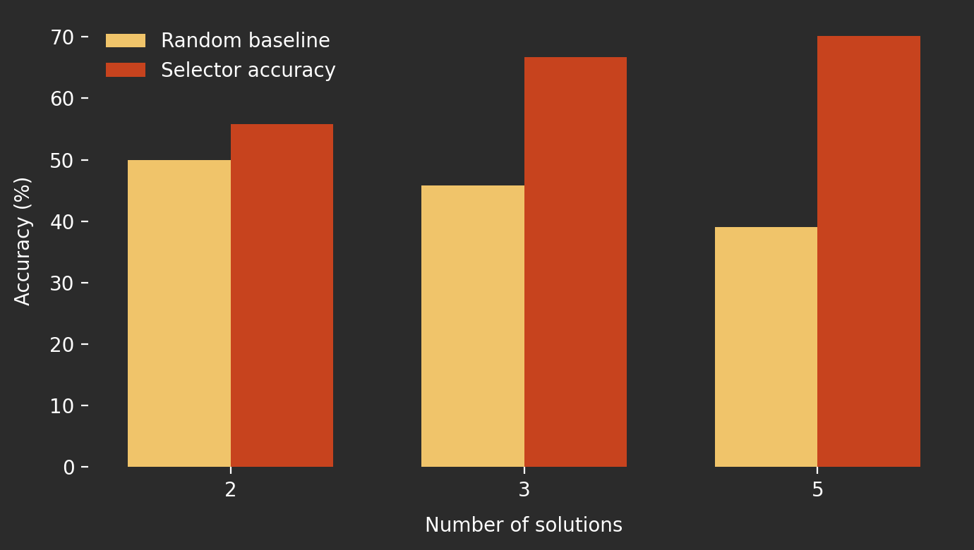 Our internal testing on code generation tasks reinforces this pattern and reveals something important about how you evaluate multiple solutions. When we scored each candidate solution independently, accuracy actually dropped below just picking the historically best-performing model. But when a selector agent reviewed all candidate solutions together, comparing them side-by-side, accuracy jumped to 75%, a 27.5 percentage point improvement over the single best model.